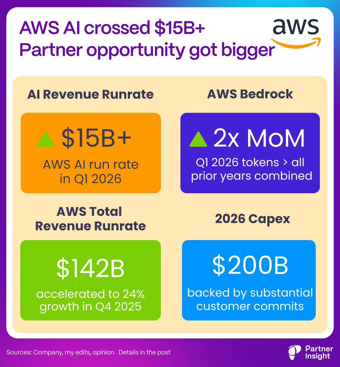 AWS AI crossed a $15B run rate — and Bedrock nearly doubled month over month in March, a strong signal that hyperscaler AI businesses are scaling fast (and partner opportunity is getting much bigger).
