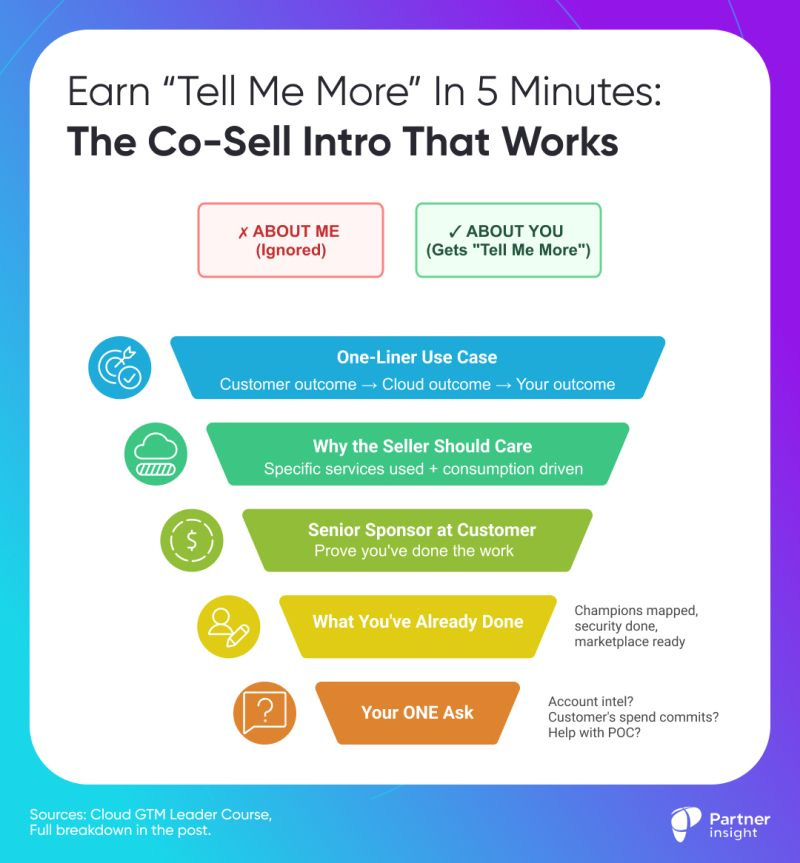 Cloud sellers carry $100M+ quotas—the exact 5-minute co-sell intro that earns “tell me more” from AWS, Azure, and Google account managers (and 3 mistakes that kill credibility)