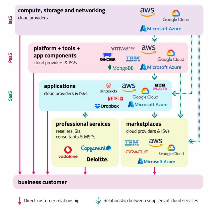 It starts with cloud hyperscalers (Amazon Web Services (AWS), Microsoft, Google) that provide access to raw computing to process workloads, store data, manage access, networking (e.g. firewall), virtualisation, etc.